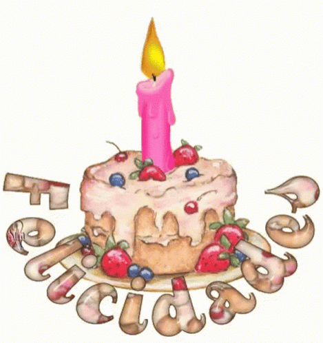 A festive birthday cake with lit candles is shown, ready for someone to blow them out.