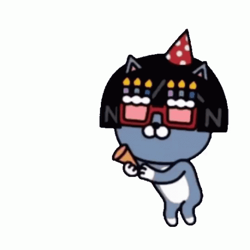 Neo from Kakao Friends celebrates a happy birthday, wearing a party hat and firing a confetti cannon.