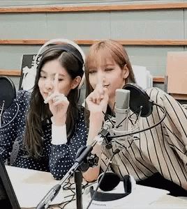 Blackpink members Jennie and Lisa share a joyful moment, laughing together in a recording studio.