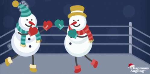Two cheerful snowmen, adorned with winter gear, playfully box in a festive boxing ring, celebrating Boxing Day.
