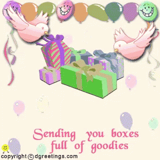 An animated birthday greeting card featuring balloons, birds, and gift boxes, wishing lots of love and best wishes.