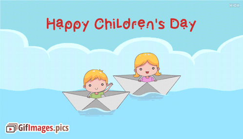 A cheerful greeting for Children's Day, featuring a cartoon boy and girl sailing in paper boats.