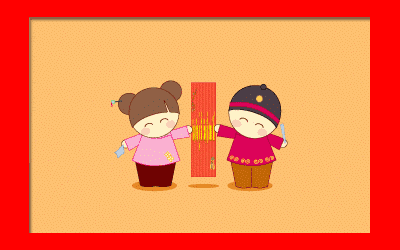 Animated children present a festive Chinese New Year greeting banner with traditional wishes.