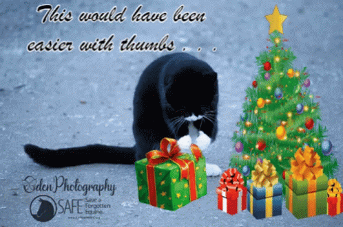A black and white cat struggles to open Christmas presents next to a decorated tree, wishing a 'Meowy Christmas'.