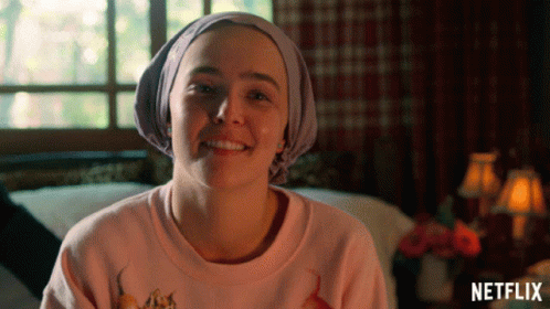 Zoey Deutch, wearing a pink shirt and purple headscarf, smiles brightly in a Netflix scene.