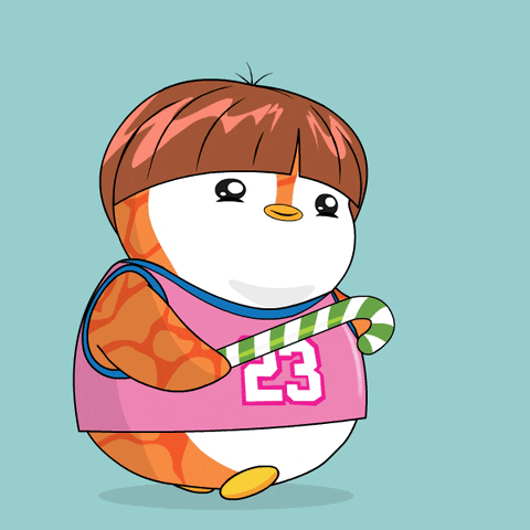 A Pudgy Penguin character with a bowl cut and pink jersey does a happy little dance while holding a candy cane.