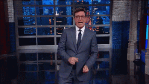 Stephen Colbert performs an excited happy dance on his late-night show set.