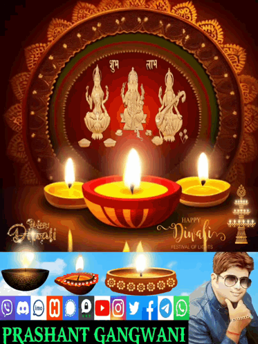 Vibrant Happy Diwali and Deepavali greeting card featuring Hindu deities, traditional lamps, and Prashant Gangwani.