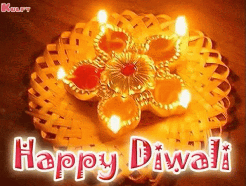 A vibrant Happy Diwali greeting card featuring lit diyas arranged in a decorative basket.