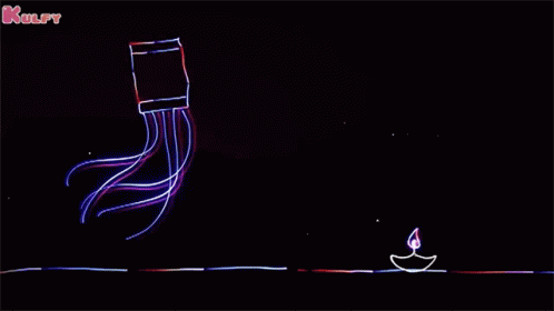 Glowing neon art wishing Happy Diwali, featuring a kite, diya, and festive lights.