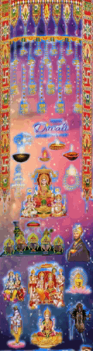 A vibrant animated scene celebrating Happy Diwali and Deepawali, featuring Goddess Lakshmi, Lord Ganesha, and other revered deities.