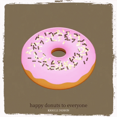 A vibrant pink donut with sprinkles, accompanied by the text 'happy donuts to everyone'.