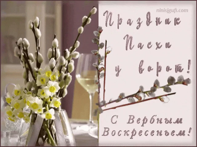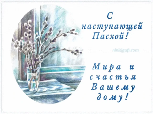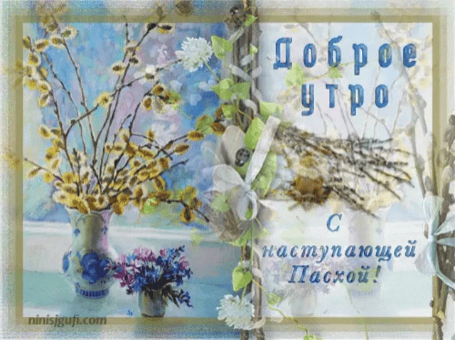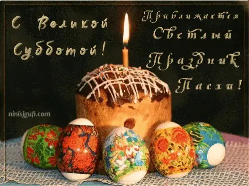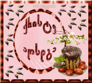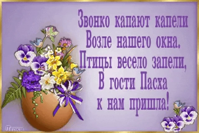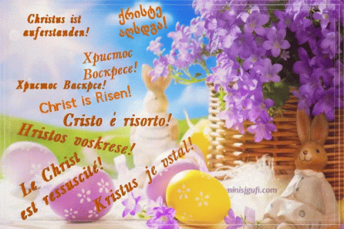 A festive Easter image with colorful eggs, purple flowers, and bunnies, wishing 'Christ is Risen' in multiple languages.
