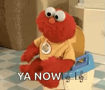 Elmo is happily dancing on a blue potty, with the text 'YA NOW' displayed on the screen.