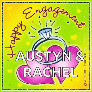 A happy engagement card for Austin and Rachel, featuring a ring and two hearts.