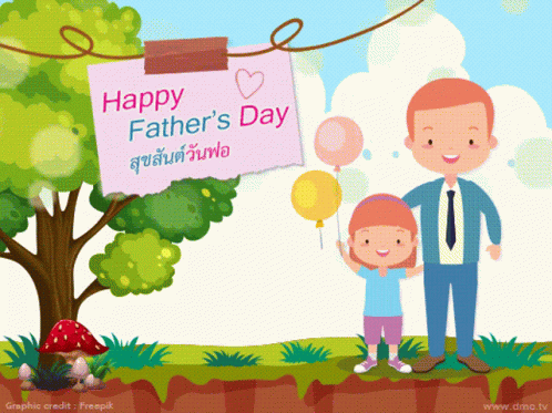 An animated card wishing 'Happy Father's Day' in English and Thai, featuring a father and daughter with balloons.