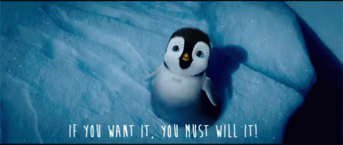 Mumble the penguin chick from Happy Feet on snow, with the motivational quote 'If you want it, you must will it!'