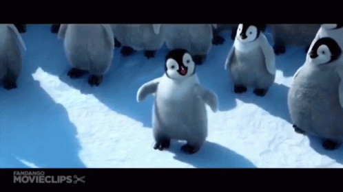 Mumble the penguin from Happy Feet joyfully dances in the snow, surrounded by other young penguins.
