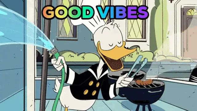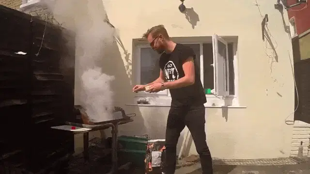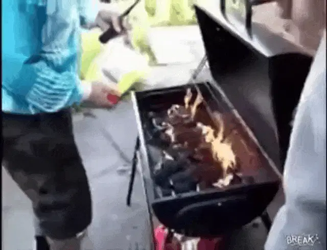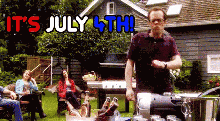 Man grilling at a backyard Fourth of July barbecue with friends, celebrating Independence Day.