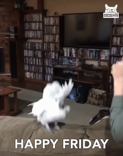 An excited white cockatoo dances enthusiastically to a person playing a flute, celebrating Happy Friday.