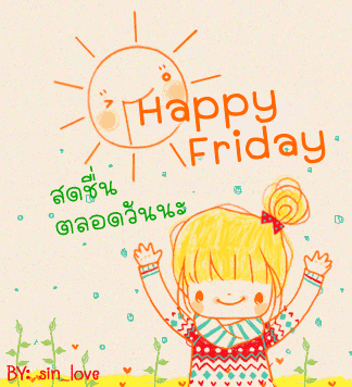 A cheerful animated girl with arms raised, smiling under the sun, wishing 'Happy Friday' with hearts.