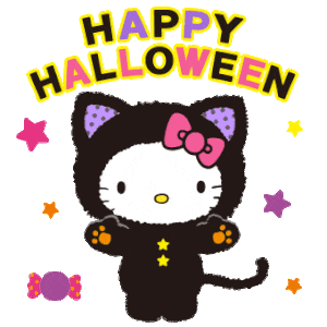 Hello Kitty in a black cat costume blinks and wishes Happy Halloween with stars and candy.