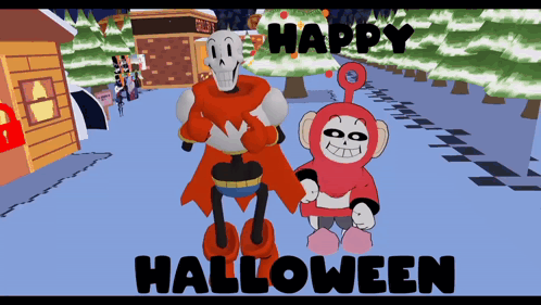 Papyrus and Sans from Undertale, dressed in Teletubbies costumes, dancing together for Happy Halloween.