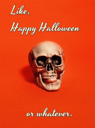A skull inflates a bubblegum bubble with a casual 'Like, Happy Halloween or whatever' message.