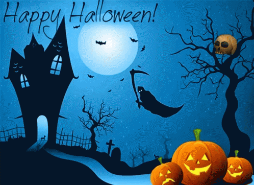 A spooky Halloween graphic featuring a haunted house, grim reaper, bats, and glowing pumpkins under a full moon.