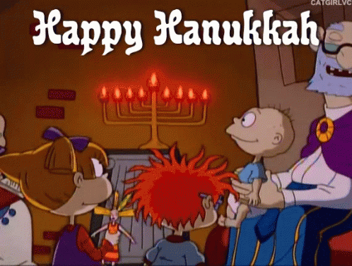 Tommy, Angelica, and Chuckie from Rugrats celebrate Happy Hanukkah with a menorah and candles.
