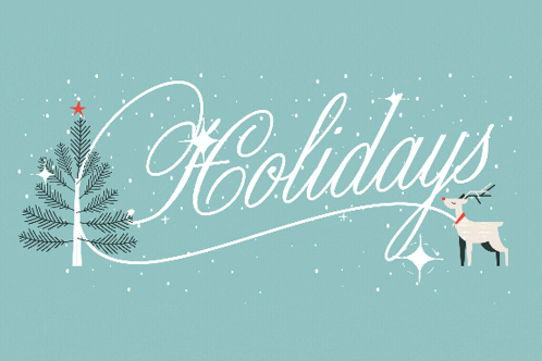 A festive animated greeting wishing Happy Holidays with a Christmas tree and a reindeer.