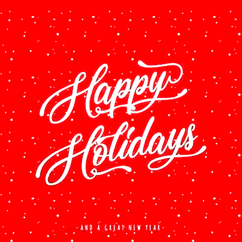 A festive red background with white script wishing 'Happy Holidays and a Great New Year'.