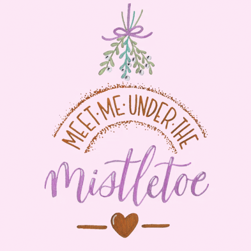 A festive graphic with "Meet Me Under The Mistletoe" text, a mistletoe sprig, and a heart on a pink background.