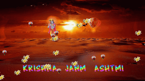 Animated greeting for Krishna Janmashtami featuring Lord Krishna, hot air balloons, and flowers against a sunset.