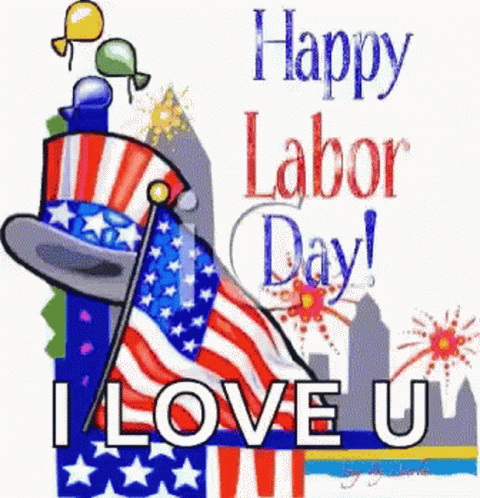 A festive greeting card for Labor Day, featuring an American flag, a patriotic top hat, and fireworks.