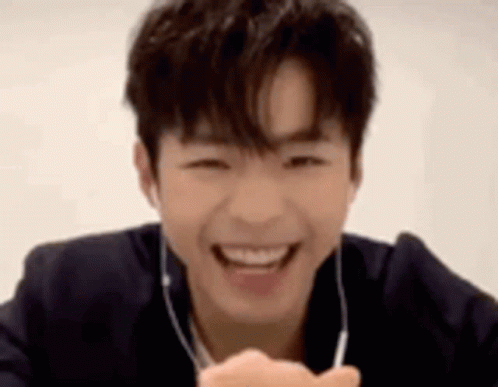 Young man laughing heartily, covering his mouth with his hand while wearing earbuds against a white background.