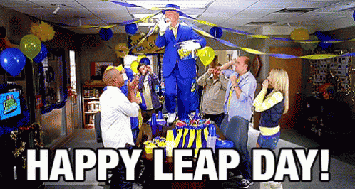 A lively Leap Day celebration from the TV show 30 Rock, featuring a group of people, balloons, and festive decorations.