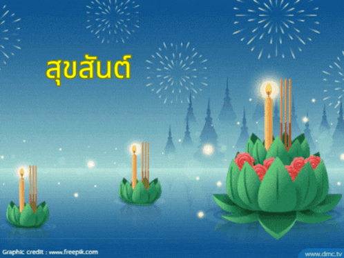 Animated scene celebrating Loy Krathong Day with floating krathongs, candles, incense, and fireworks in the night sky.