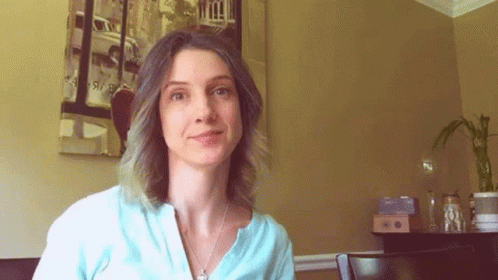 A happy woman in a light blue shirt smiles playfully, putting her hands to her face in a joyful gesture.