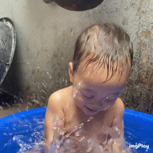 Happy baby splashes and laughs joyfully during bath time in a blue bucket.