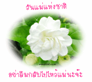 A beautiful white jasmine flower with sparkling effects, wishing 'National Mother's Day' in Thai and reminding to pay respect to mom.