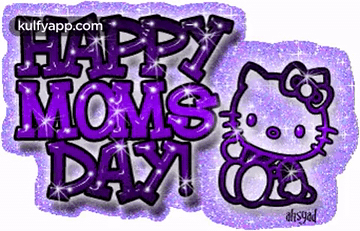 A sparkling Hello Kitty wishes 'Happy Moms Day' on a glittery purple background, perfect for Mother's Day.