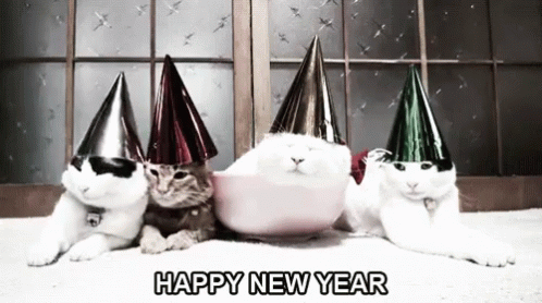 Adorable cats wearing festive party hats, celebrating and wishing a Happy New Year.