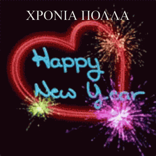 A vibrant greeting for Happy New Year 2020 featuring a glowing heart outline and colorful fireworks.