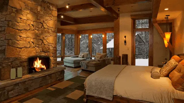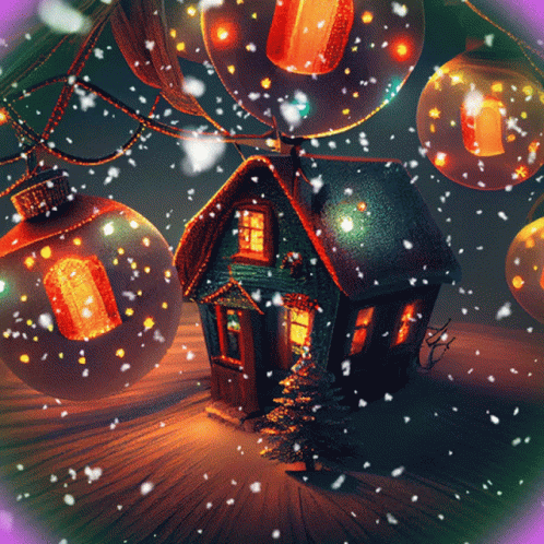 A cozy house decorated with festive lights and falling snow, wishing a Happy New Year 2024.