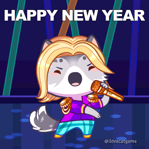 A cute cartoon cat character with blonde hair joyfully sings "Happy New Year" into a microphone, celebrating 2024.
