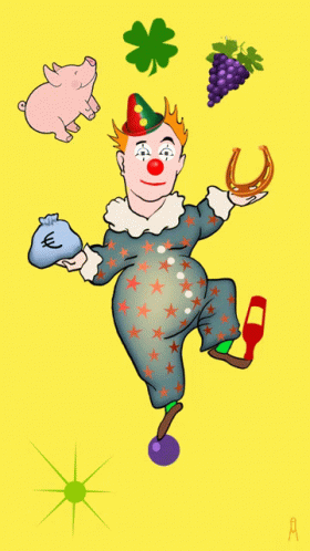 Cartoon clown with good luck symbols wishing Happy New Year, holding money bag and horseshoe.