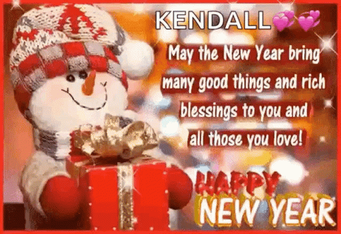 A festive New Year greeting card featuring a snowman holding a gift, with a special message for Kendall.