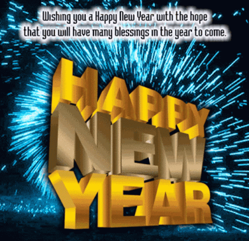 Celebrate the New Year with a vibrant greeting card featuring golden 'Happy New Year' text and dazzling blue fireworks.