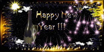 A festive 'Happy New Year' greeting with champagne, sparkles, and glitter.